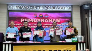 NUSANTARAKALTIM, TANJUNG REDEB – Upaya kepolisian memutus rantai peredaran narkotika di Kabupaten Berau kembali ditandai dengan pemusnahan barang bukti sabu